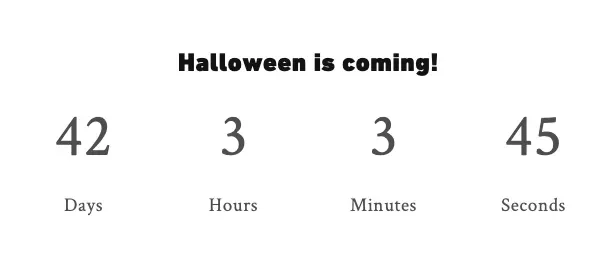 <h2 class="countdown-timer-heading">Halloween is coming soon!</h2> <div class="countdown-timer-container"> <div class="countdown-timer-values" id="days">00</div> <div class="countdown-timer-values" id="hours">00</div> <div class="countdown-timer-values" id="minutes">00</div> <div class="countdown-timer-values" id="seconds">00</div> <div>Days</div> <div>Hours</div> <div>Minutes</div> <div>Seconds</div> </div> <style> .countdown-timer-heading { font-size: 2em; margin-bottom: 0; text-align: center; } .countdown-timer-container { width: 90%; max-width: 600px; margin: 0 auto; display: flex; flex-direction: row; flex-wrap: wrap; margin-bottom: 48px; } .countdown-timer-container div { width: 25%; text-align: center; font-size: 30px; } .countdown-timer-values { font-size: 60px !important; } </style> <script type="text/javascript"> // Counting down to Halloween const halloweenDate = new Date("2024-10-31"); const daysValue = document.querySelector("#days"); const hoursValue = document.querySelector("#hours"); const minutesValue = document.querySelector("#minutes"); const secondsValue = document.querySelector("#seconds"); // Run the function every second aka 1000 ms let x = setInterval(function () { let dateTimeNow = new Date().getTime(); let difference = halloweenDate - dateTimeNow; // Calculating time and assigning values daysValue.innerHTML = Math.floor(difference / (1000 * 60 * 60 * 24)); hoursValue.innerHTML = Math.floor((difference % (1000 * 60 * 60 * 24)) / (1000 * 60 * 60)); minutesValue.innerHTML = Math.floor((difference % (1000 * 60 * 60)) / (1000 * 60)); secondsValue.innerHTML = Math.floor((difference % (1000 * 60)) / 1000); if (difference < 0) { clearInterval(x); } }, 1000); </script>